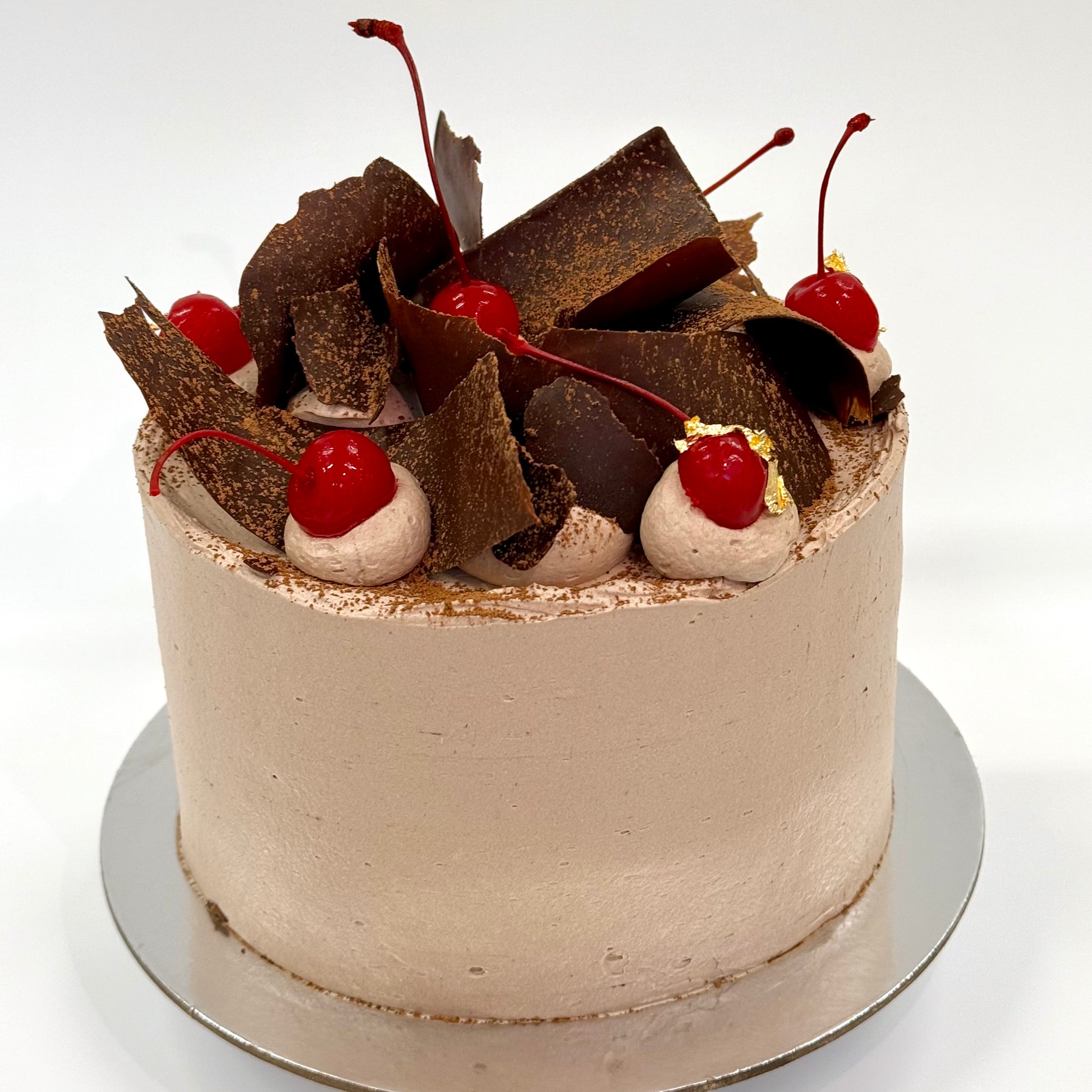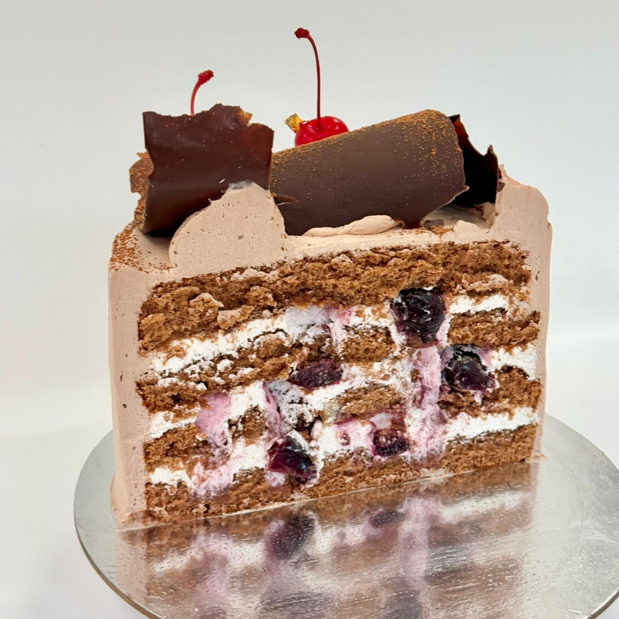 This decadent creation features layers of moist Kirsch soaked chocolate sponge, generously filled with velvety fresh cream and black cherries. Decorated with chocolate cream, chocolate shards, maraschino cherries and a dusting of cocoa powder.