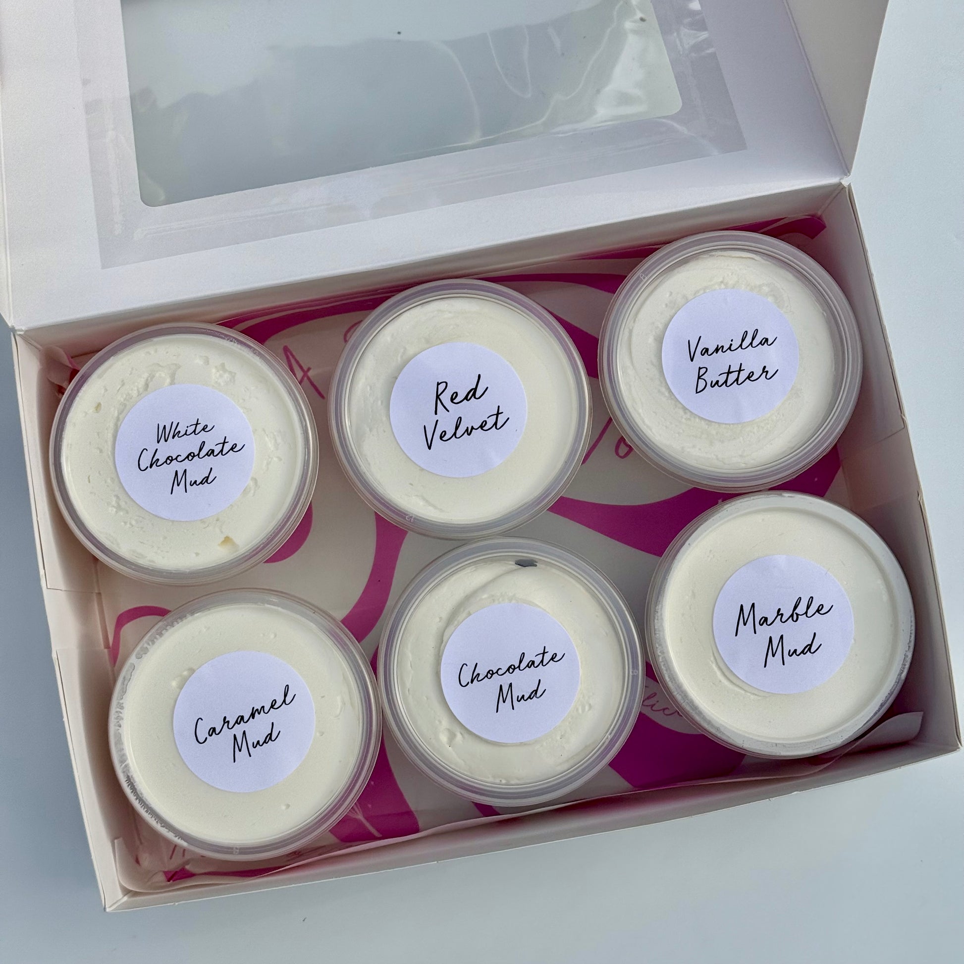 CLASSIC FLAVOUR BOX includes 1x slice of each of the following 6 flavours. All flavours are topped with vanilla Italian meringue buttercream as this is what we use to decorate the outside of our cakes. Cakes + fillings are paired as we recommend them, but you're welcome to mix + match!
