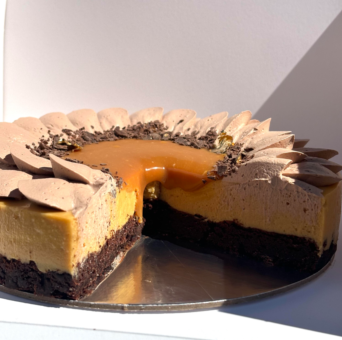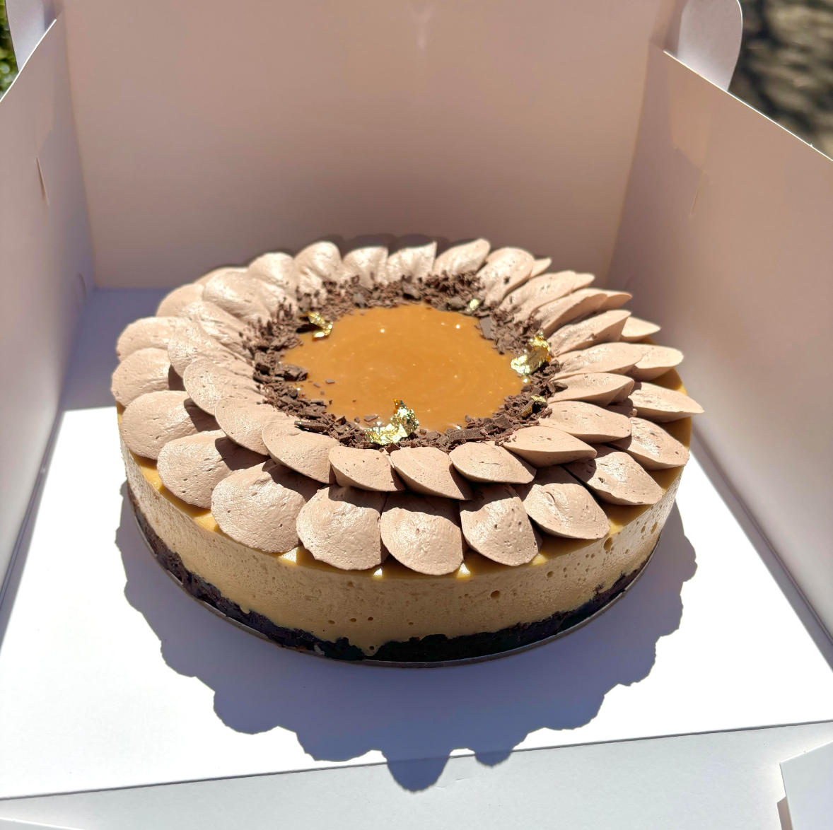 A rich dark chocolate beté noir base, paired with a decadent caramel mousse, decorated with fresh chocolate cream and salted caramel. Topped with chocolate flakes and gold leaf! The perfect sweet treat for everyone to enjoy!