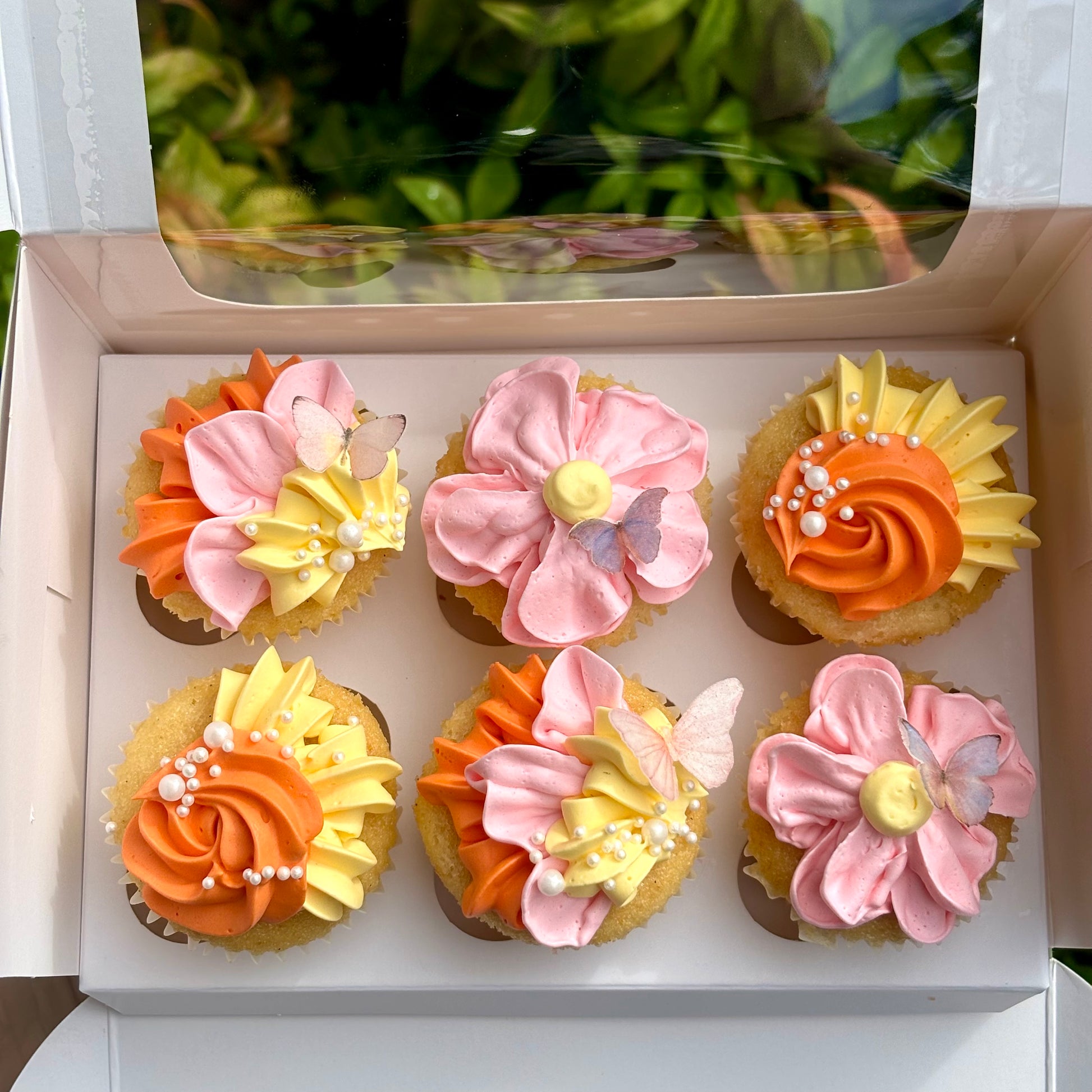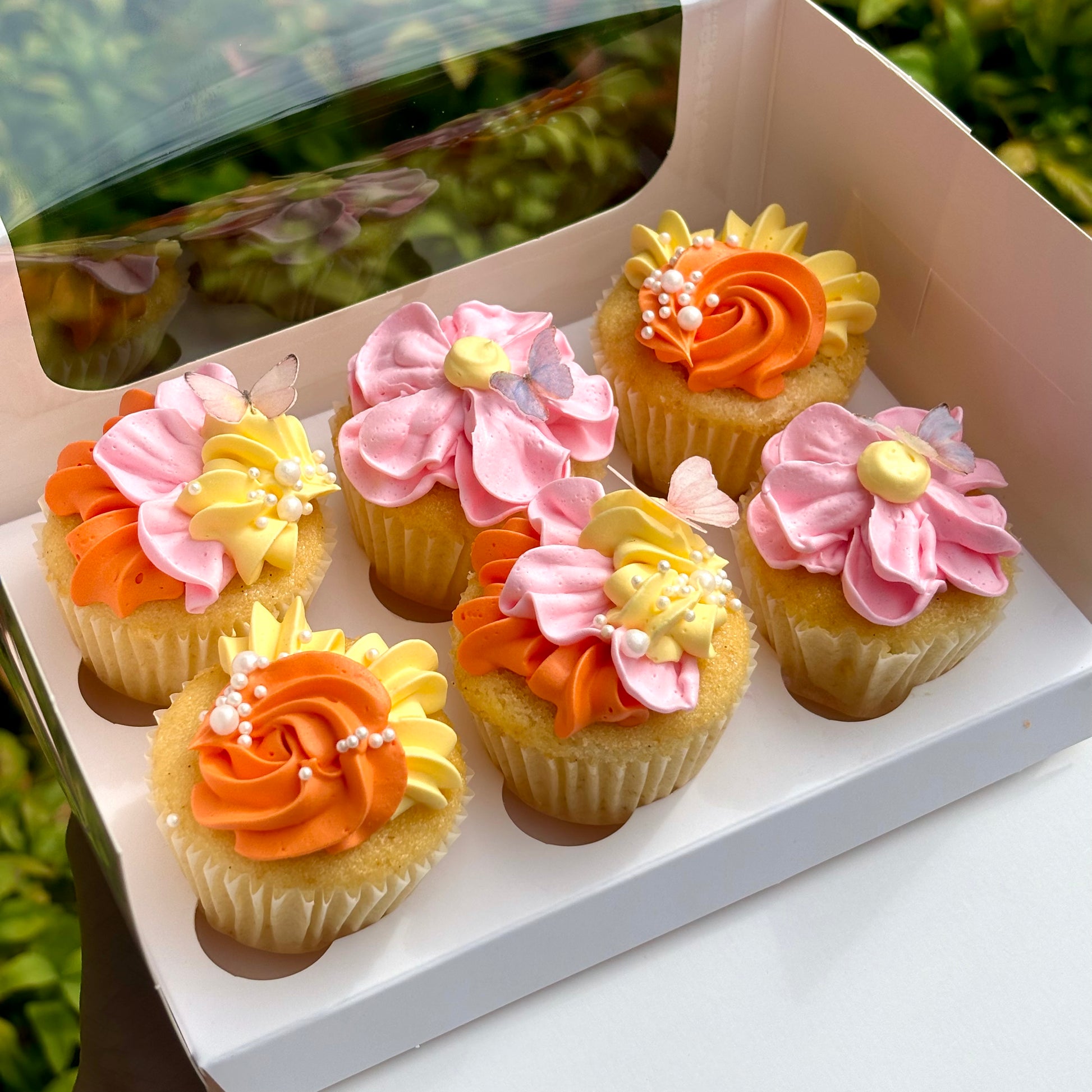 Cute and delicious cupcakes decorated with Italian meringue buttercream floral piping in your choice of up to three colours, as well as edible pearls and wafer butterflies!