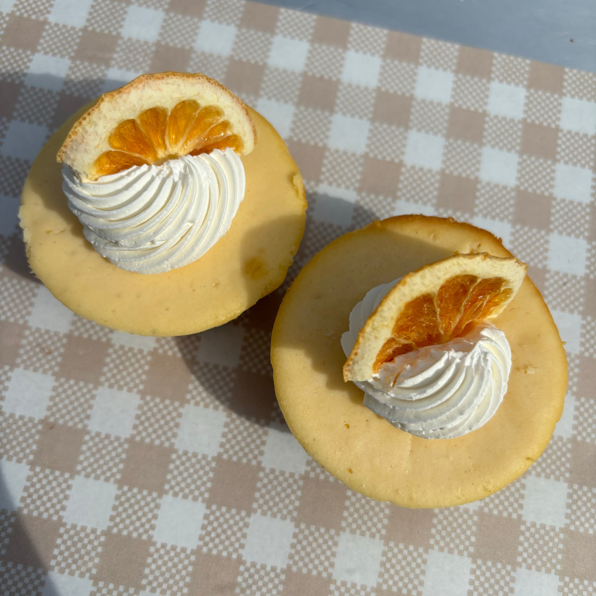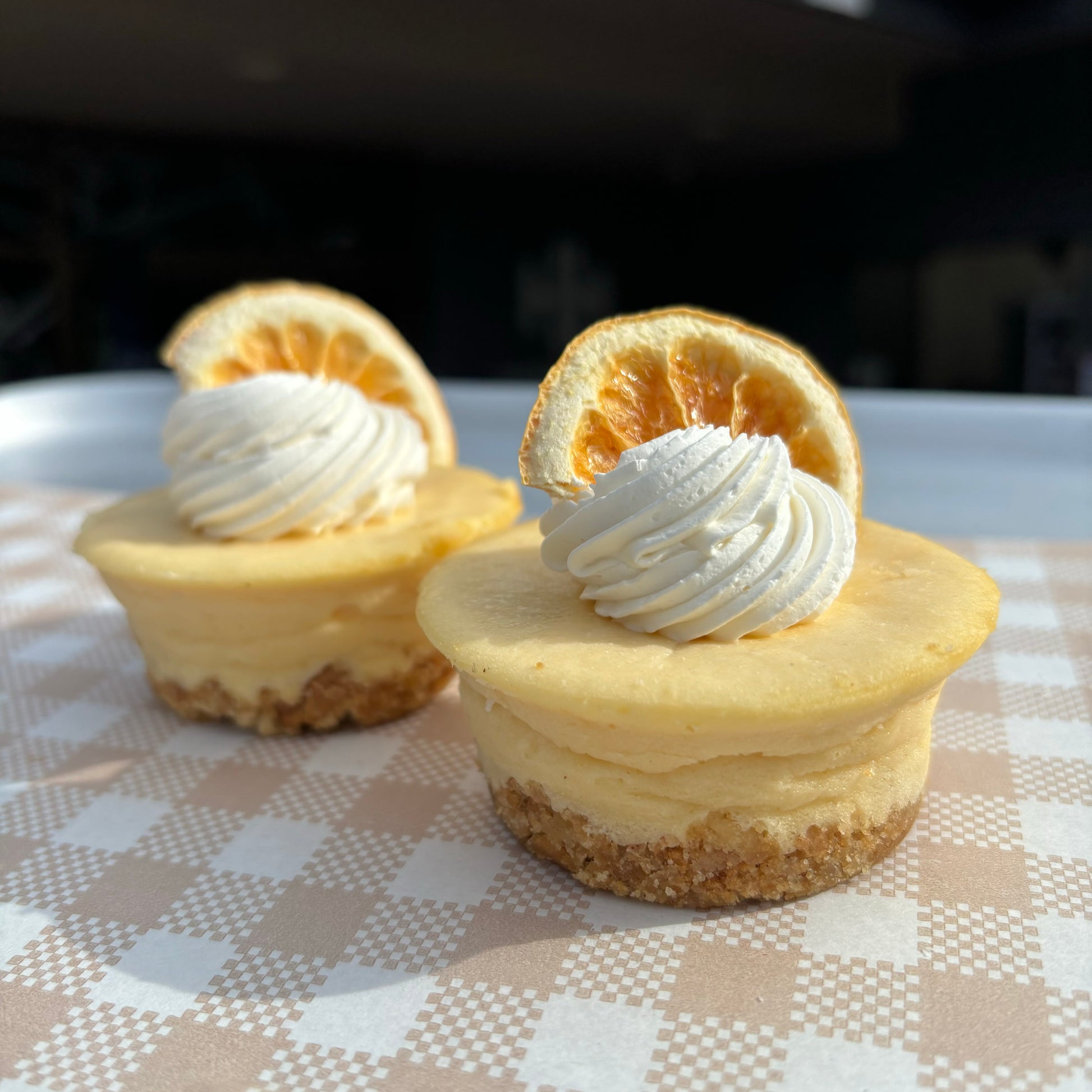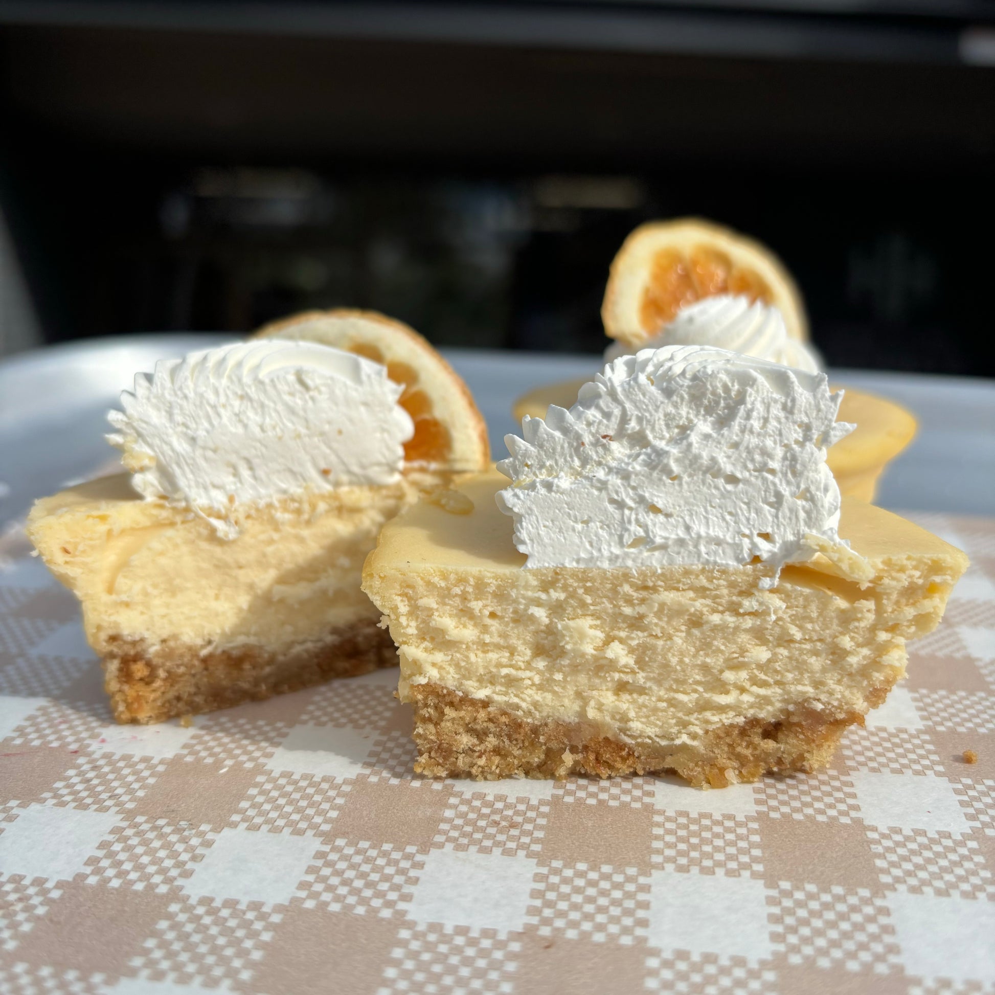 A mini, thick and creamy baked New York cheesecake on a biscuit base. Decorated with a swirl of fresh cream and dehydrated citrus.