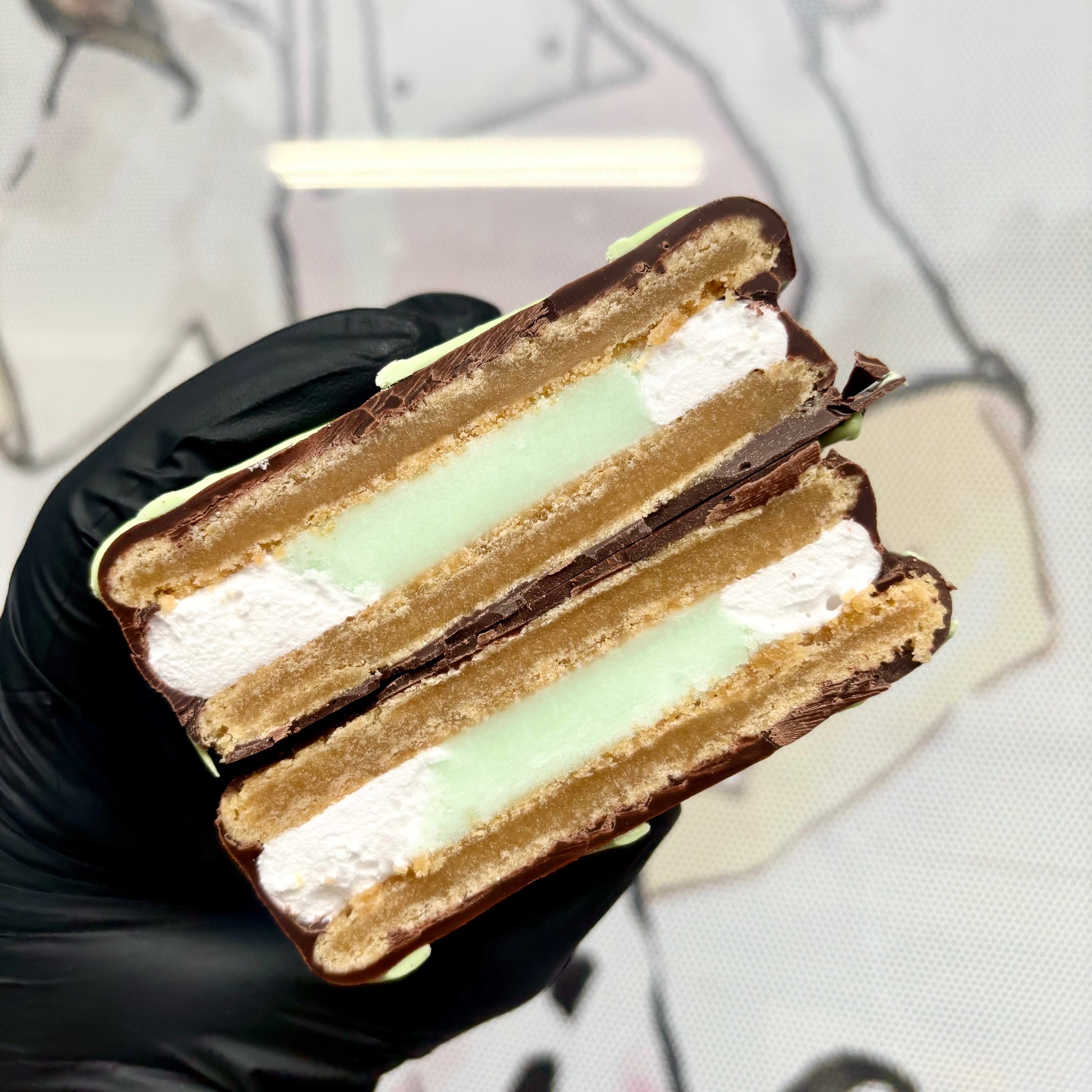 A decadent cookie and marshmallow inside filled with refreshing mint, covered in a crisp and rich chocolate outside! A nostalgic snack that delivers both comfort and freshness with every bite.