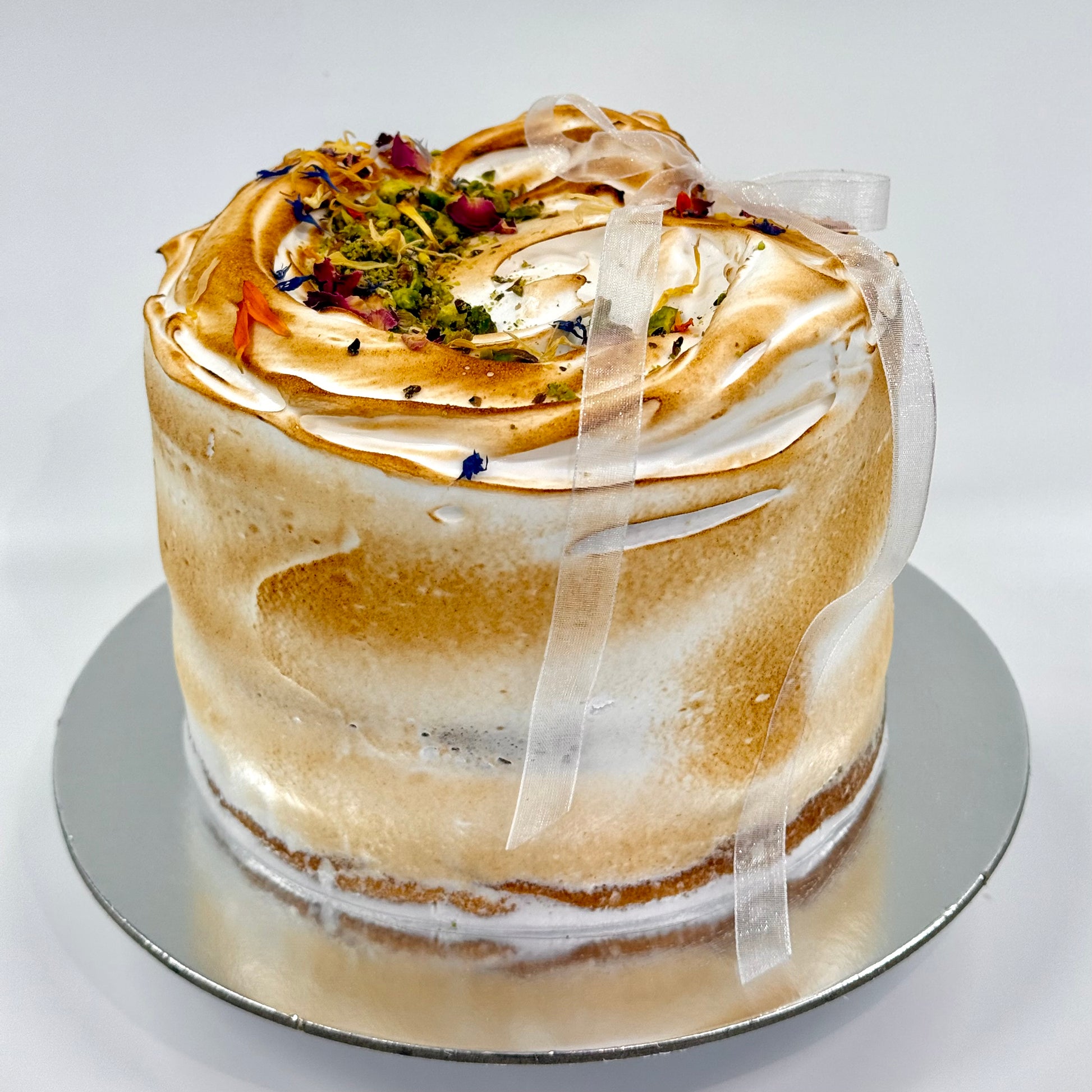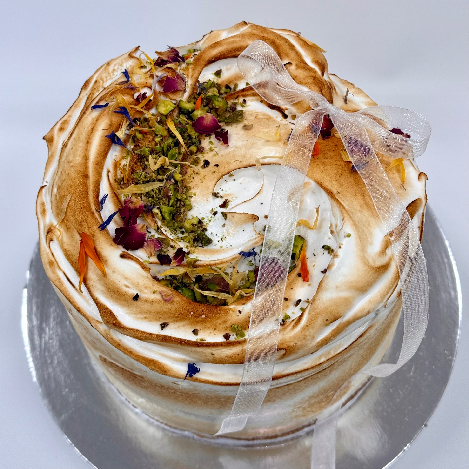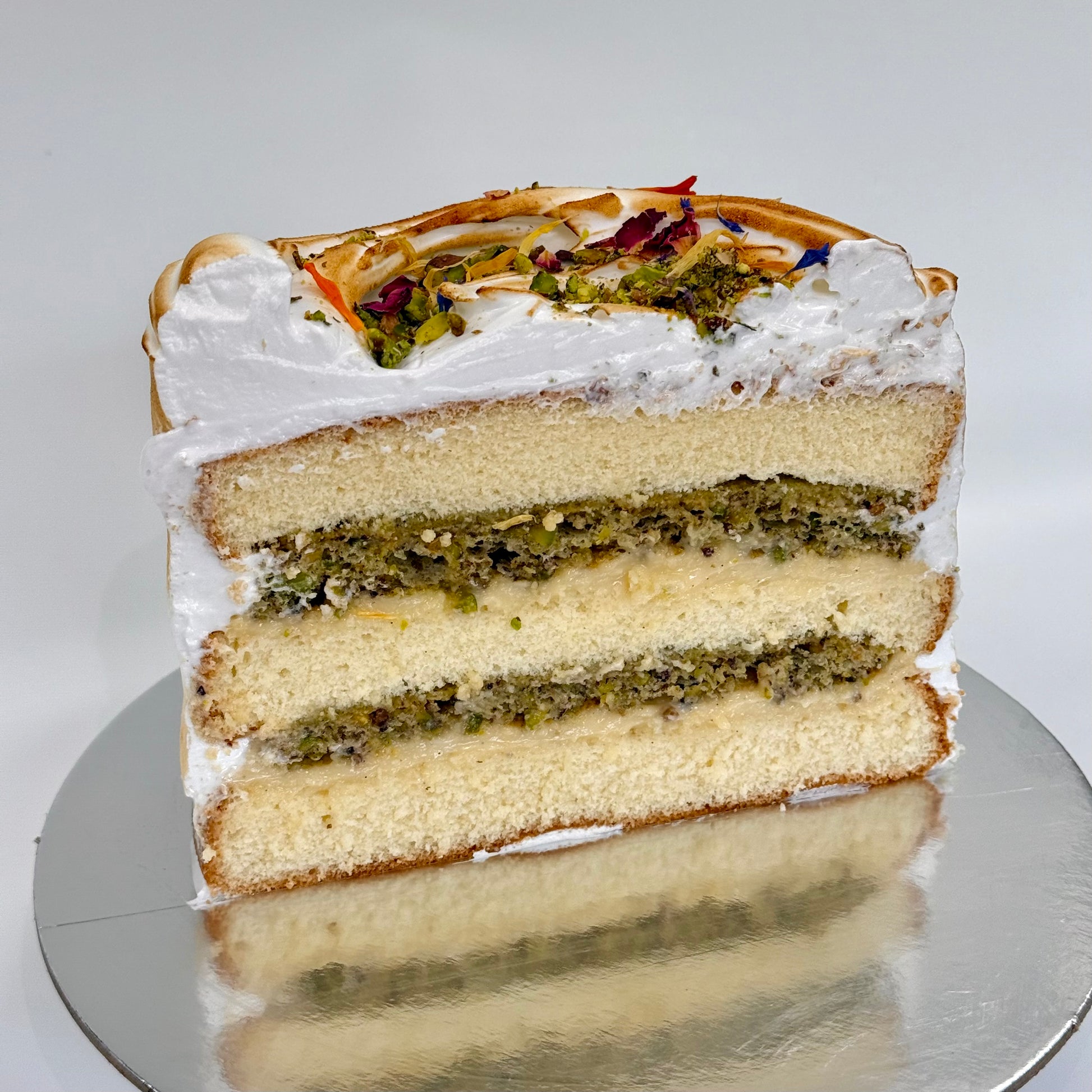 A beacon of the balance between sweet and salted on a vanilla sponge base, paired with dacquoise, vanilla bean custard, pistachio cream and topped with torched Italian meringue, this cake is as stunning as it is delicious. Ideal for those who crave a light yet indulgent treat.