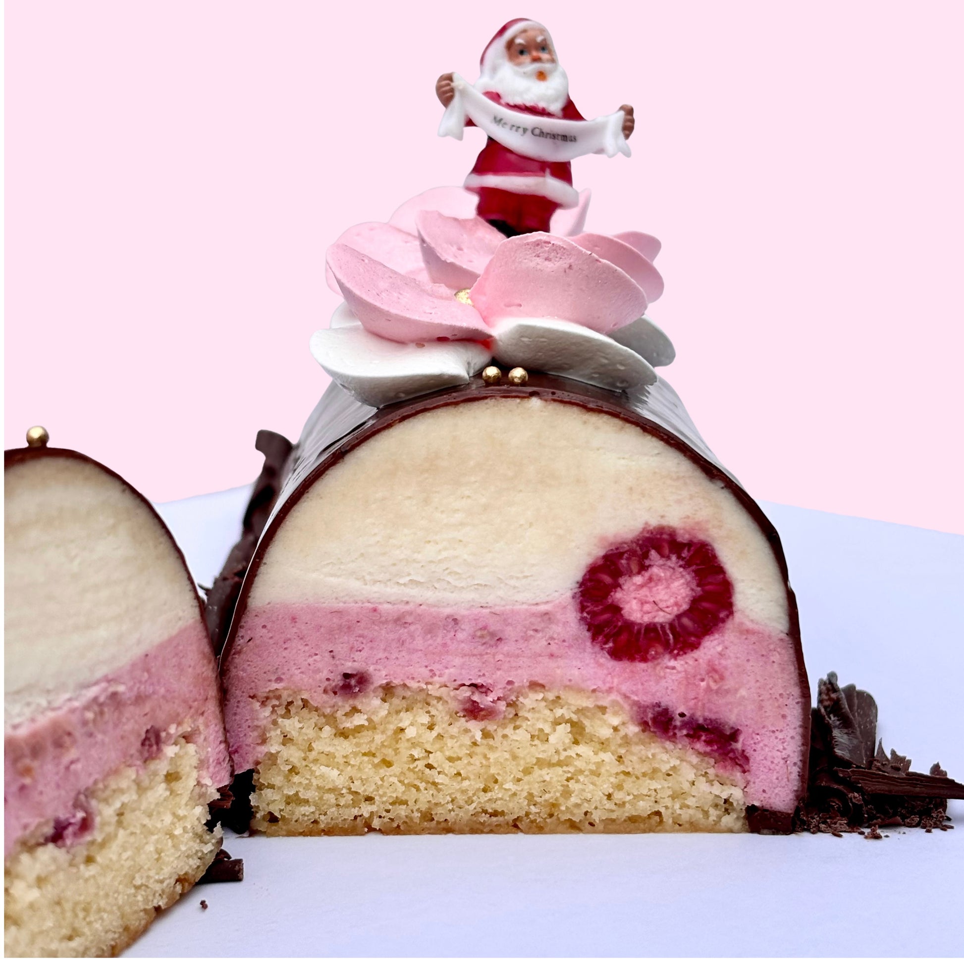 Our take on a Christmas Yule Log, made with a white chocolate and raspberry mud cake base, layers of white chocolate mousse and raspberry mousse, coated in dark chocolate glaze and dark chocolate flakes, decorated with vanilla and strawberry fresh cream piping, gold sprinkles, and plastic Santa figurines.
