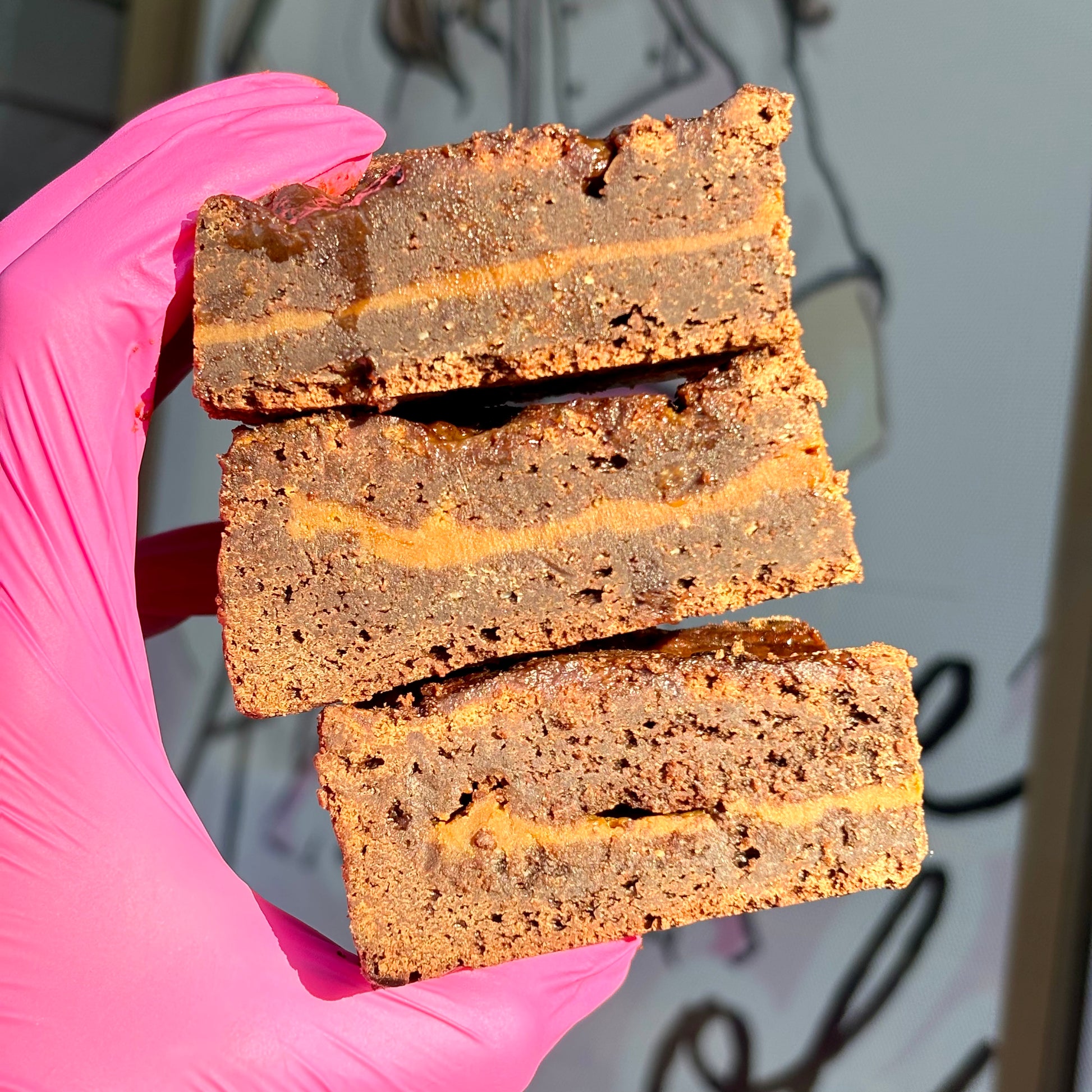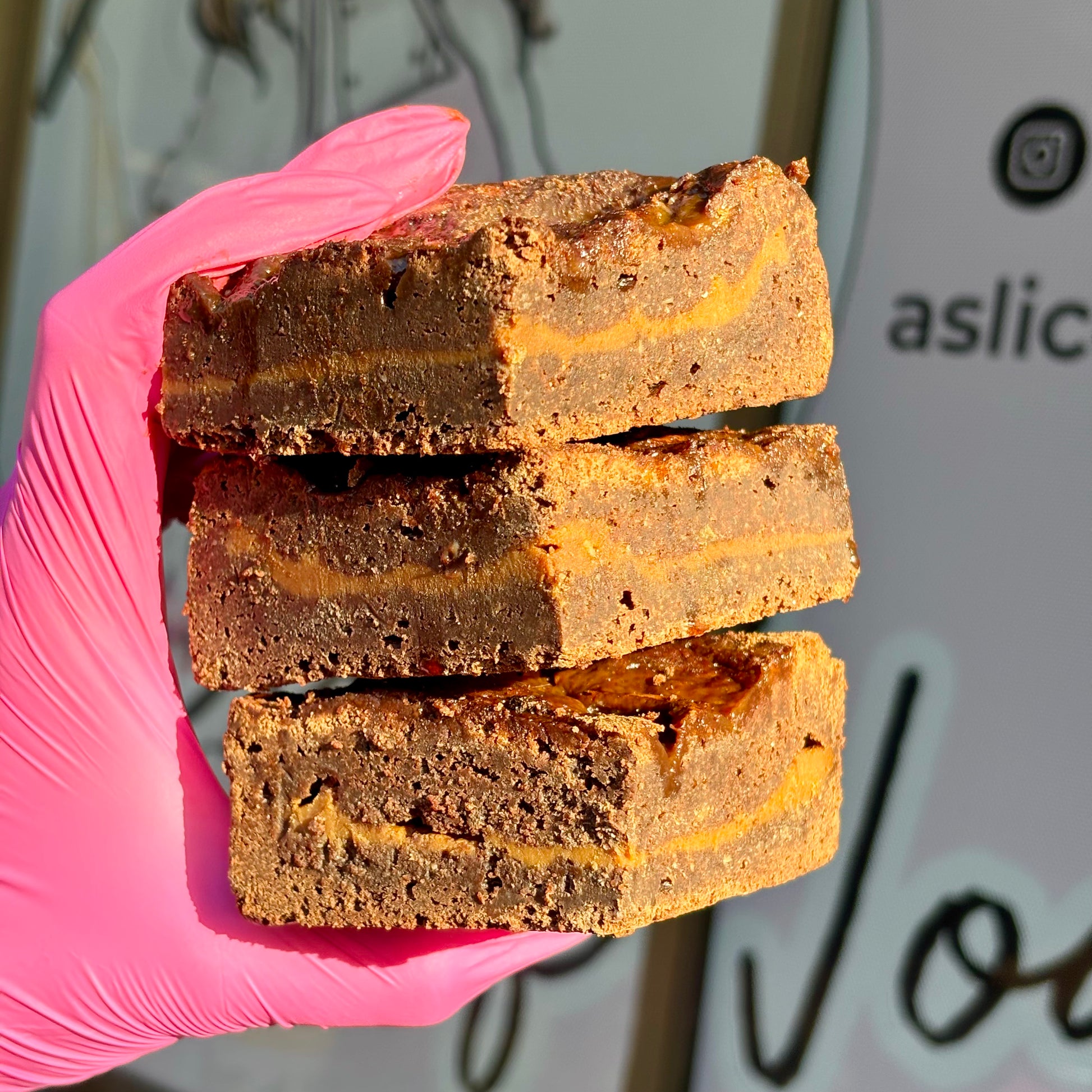Rich fudgey brownie filled with a layer of salted caramel and topped with caramel swirls and sea salt flakes. The perfect mix of salty and sweet!