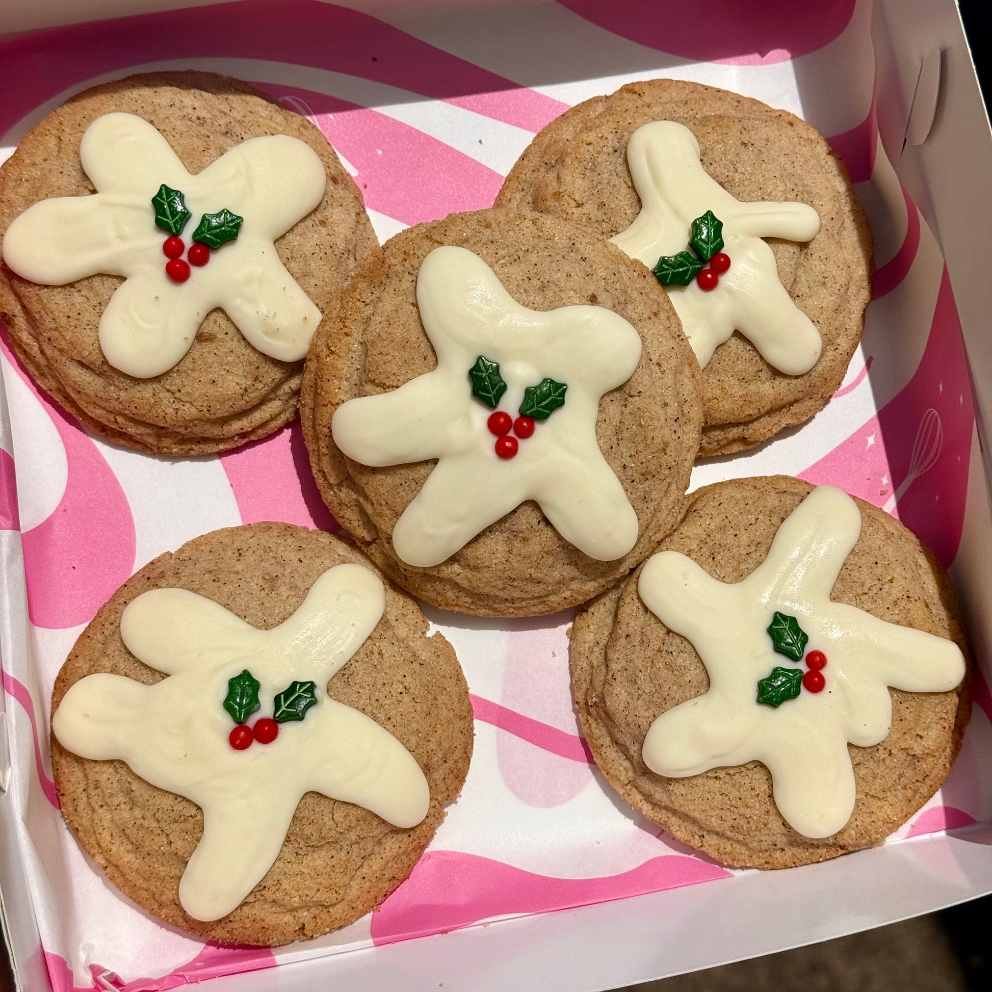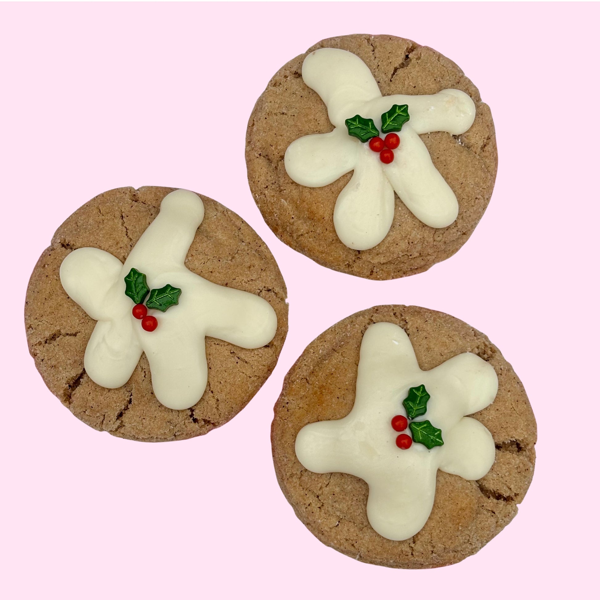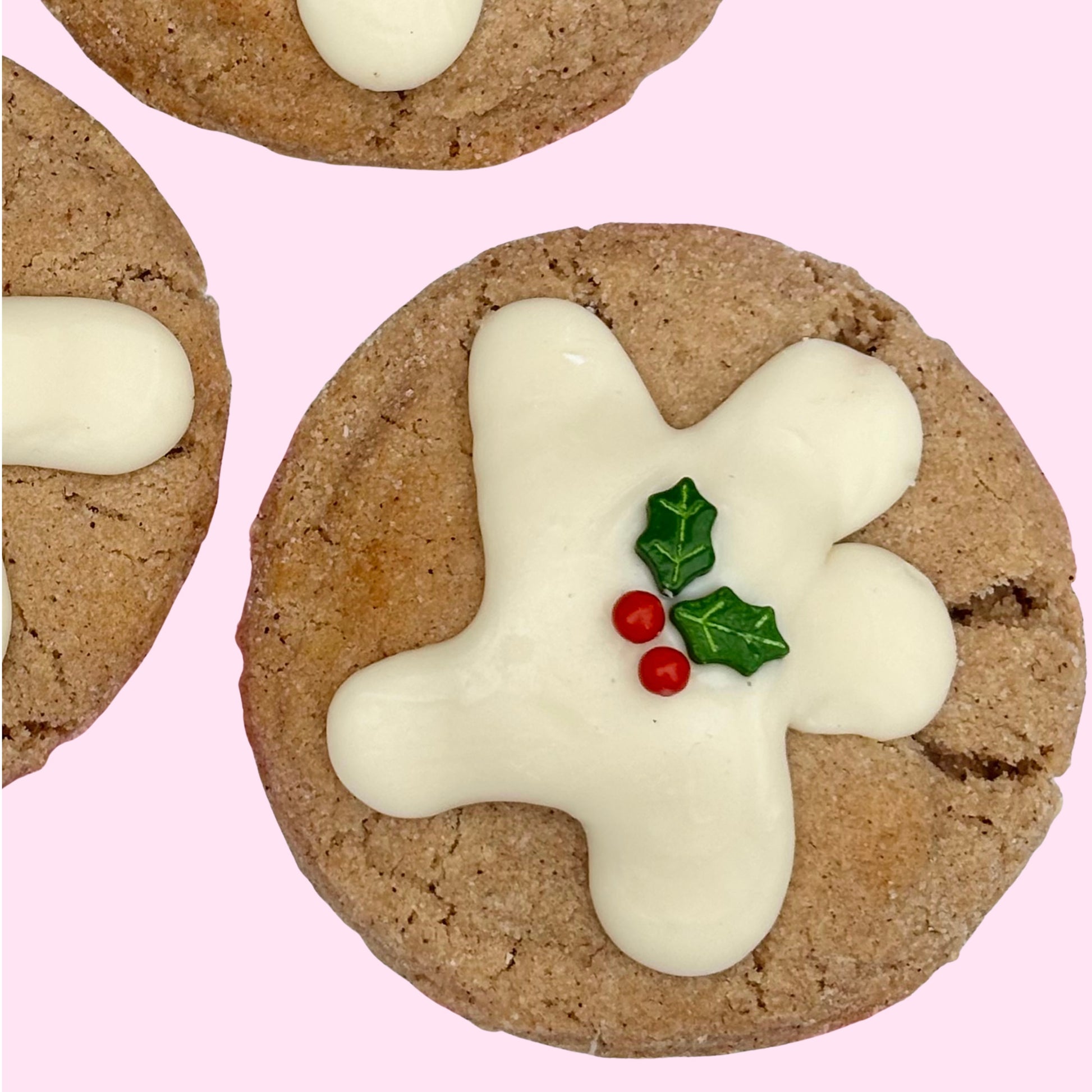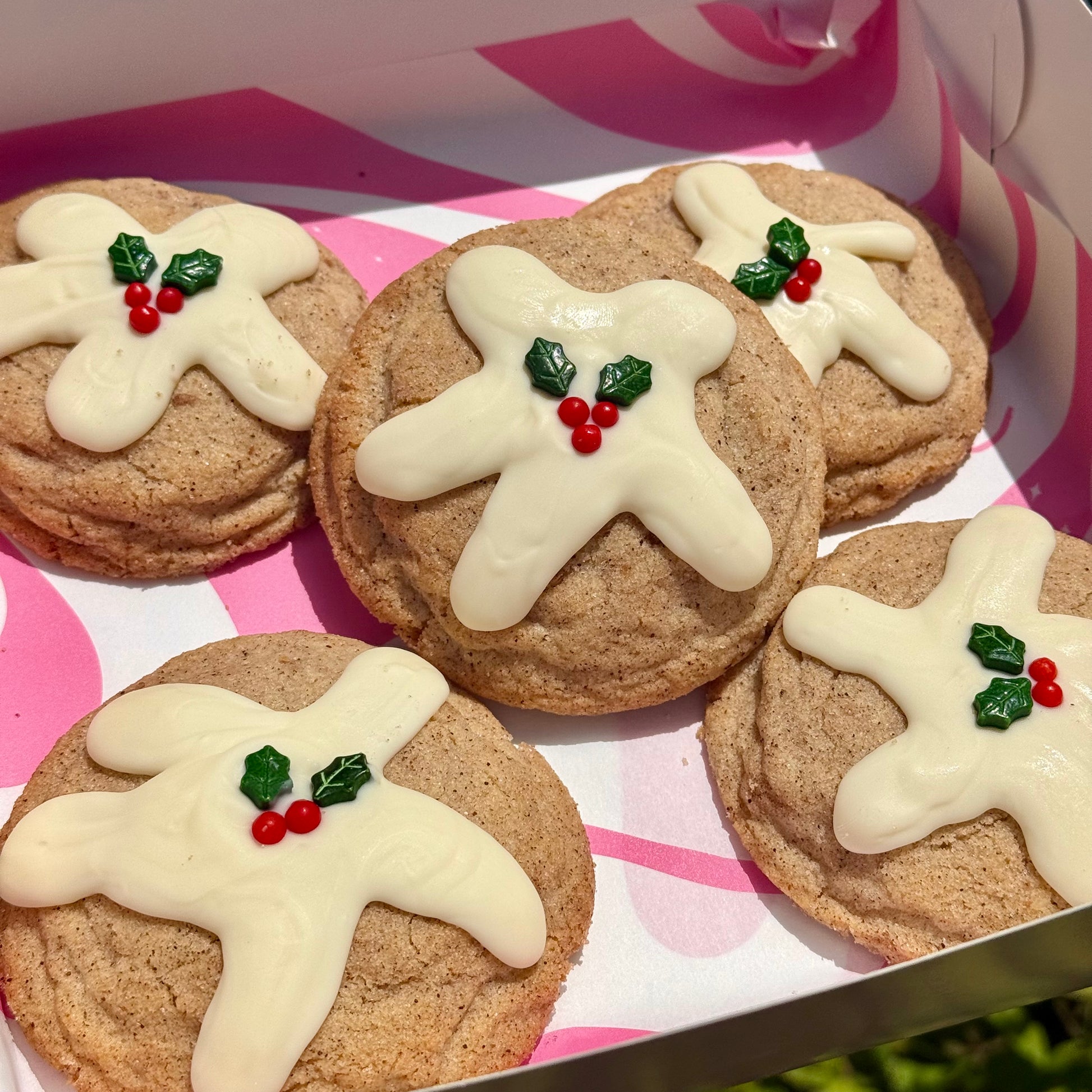 Soft, cinnamon spiced Snickerdoodle cookies decorated to look like little puddings with white chocolate and holly sprinkles.