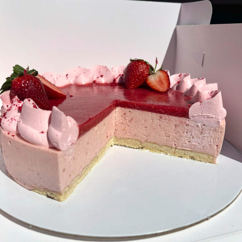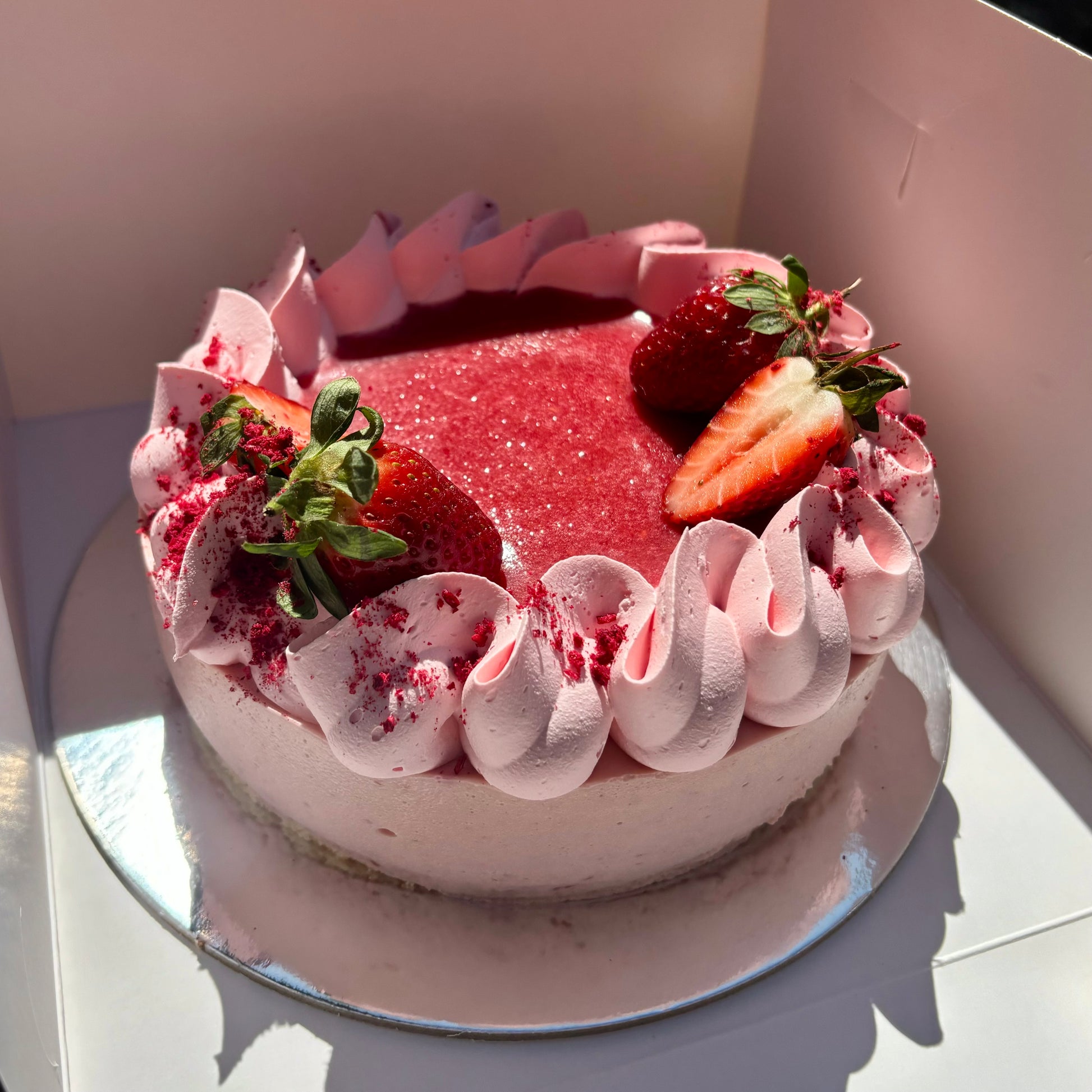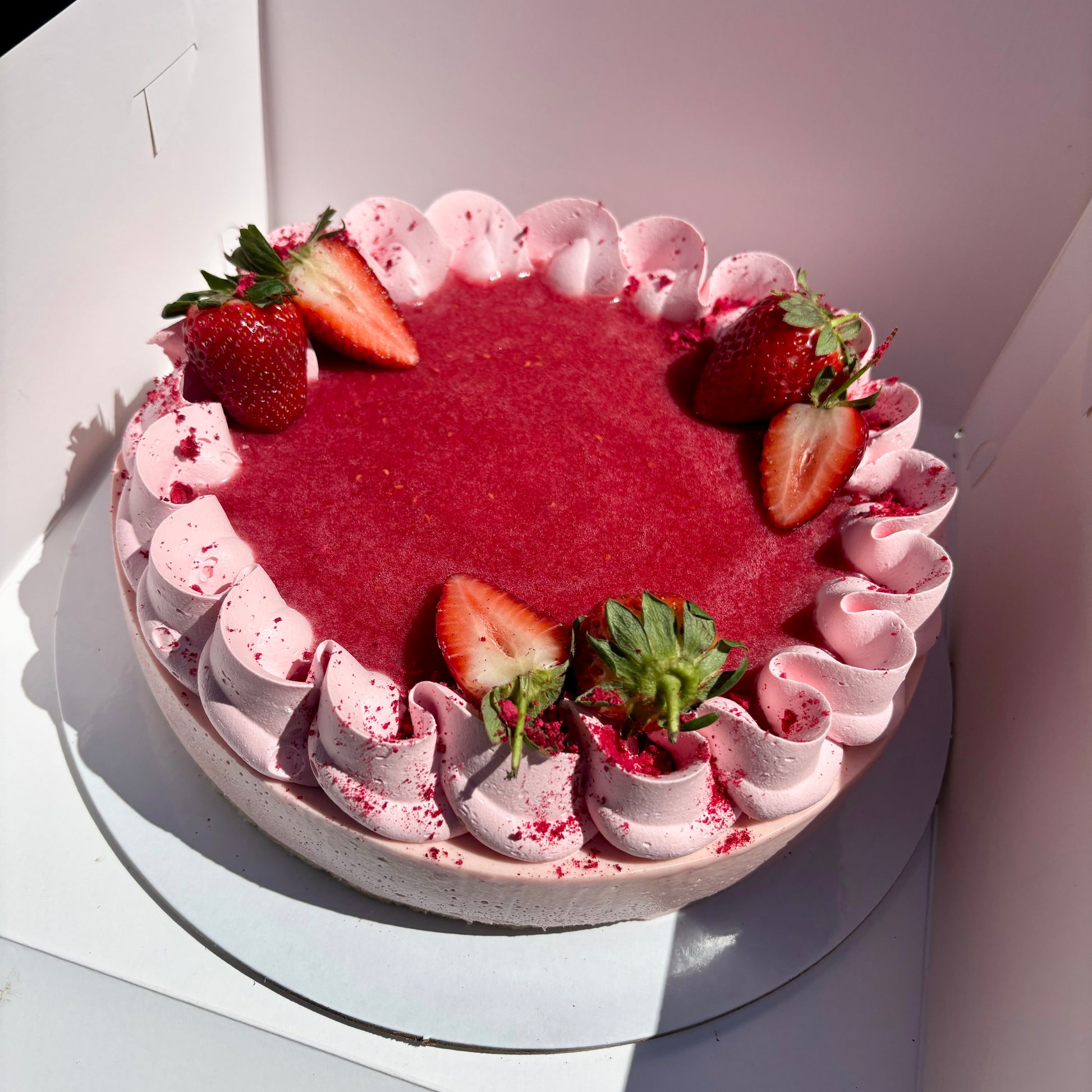 A crisp shortbread base paired with a refreshing strawberry mousse. Decorated with a pretty piped border of fresh cream and a strawberry glaze, then topped with fresh strawberries and a sprinkle of dehydrated raspberries. The perfect fresh treat for any occasion!