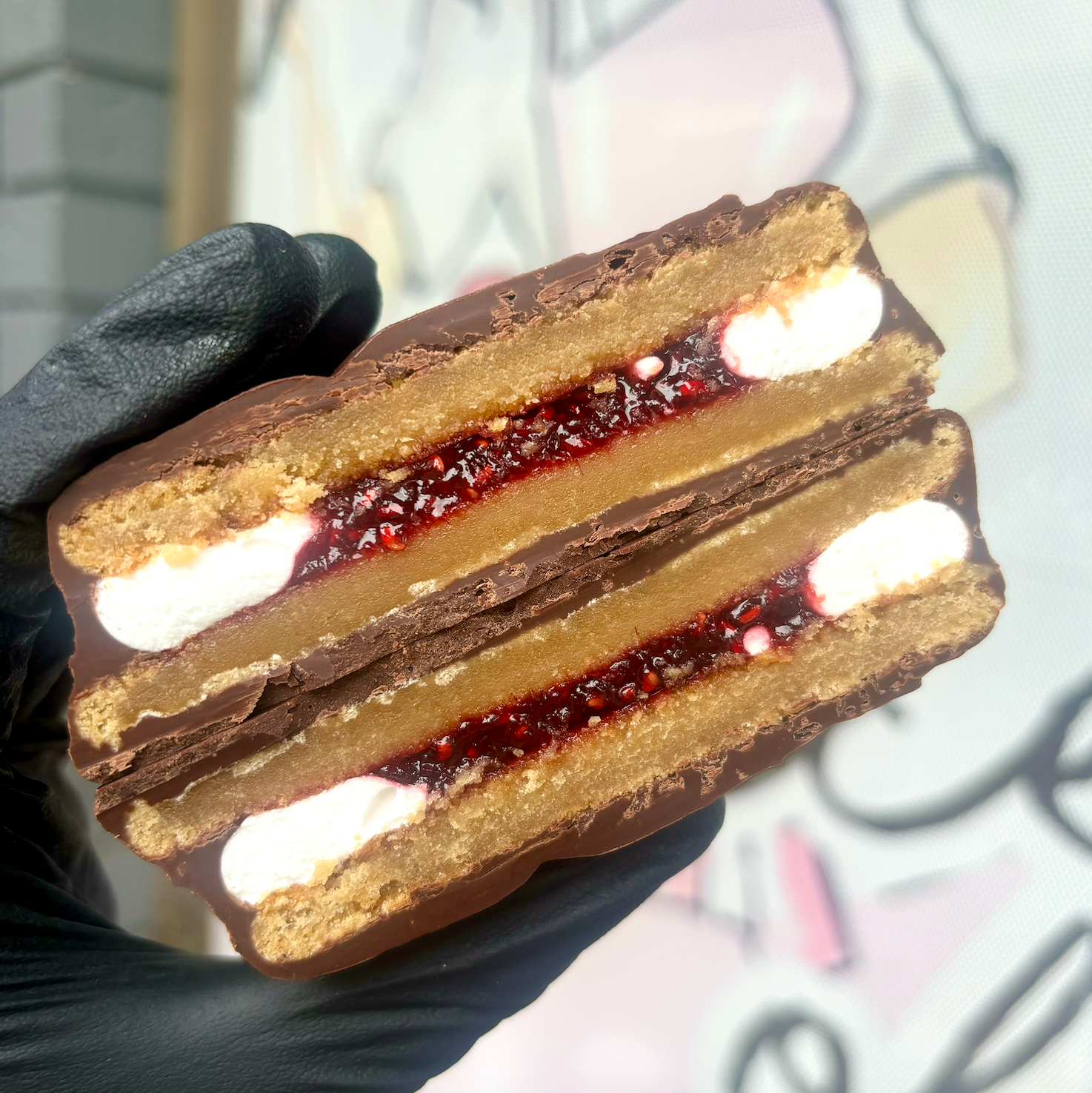 A decadent cookie and marshmallow inside, with a fresh jam filling and covered in a rich chocolate outside! The perfect reimagined classic!