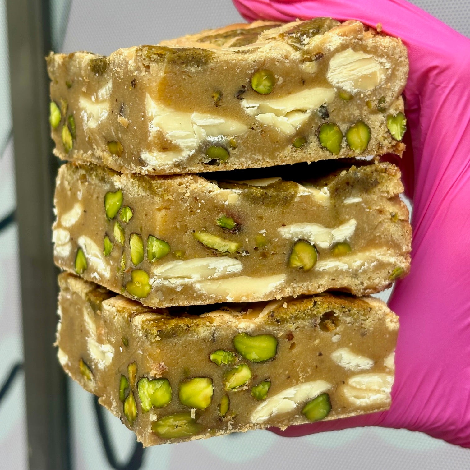 Fudgey blondie scattered with roasted and salted crunchy pistachios and white chocolate chunks. Topped with swirls of Pistachio cream!